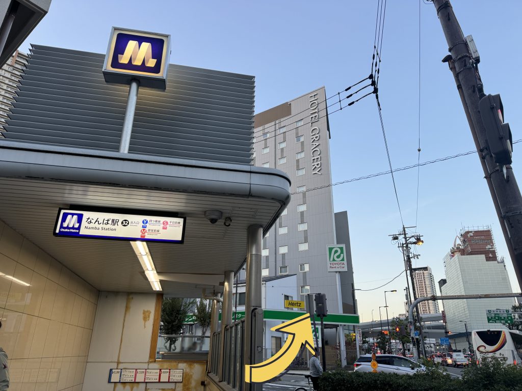 大阪メトロ 四つ橋線「なんば駅」南改札口よりホテルまでのご案内 大阪メトロ 四つ橋線 「なんば駅」 南改札口 32番出口から 徒歩1分 動画でのご案内はこちら 1 南改札を出て右手に32番出口がございます。 2 地上に上がればすぐ後ろにホテルがございます。