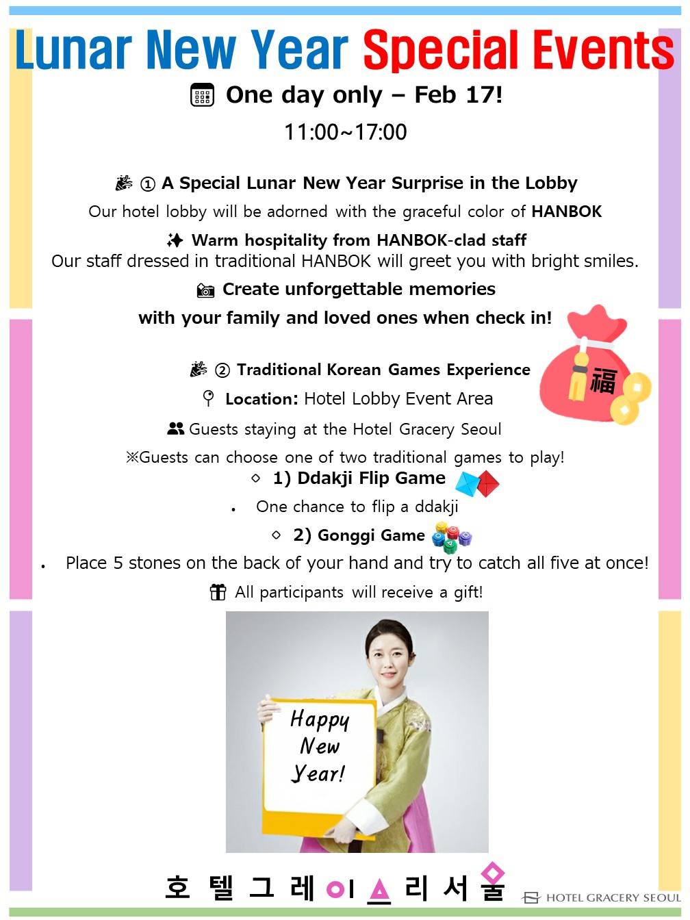 The featured event this month is Seollal (Lunar New Year), which will be held on Tuesday, February 17.